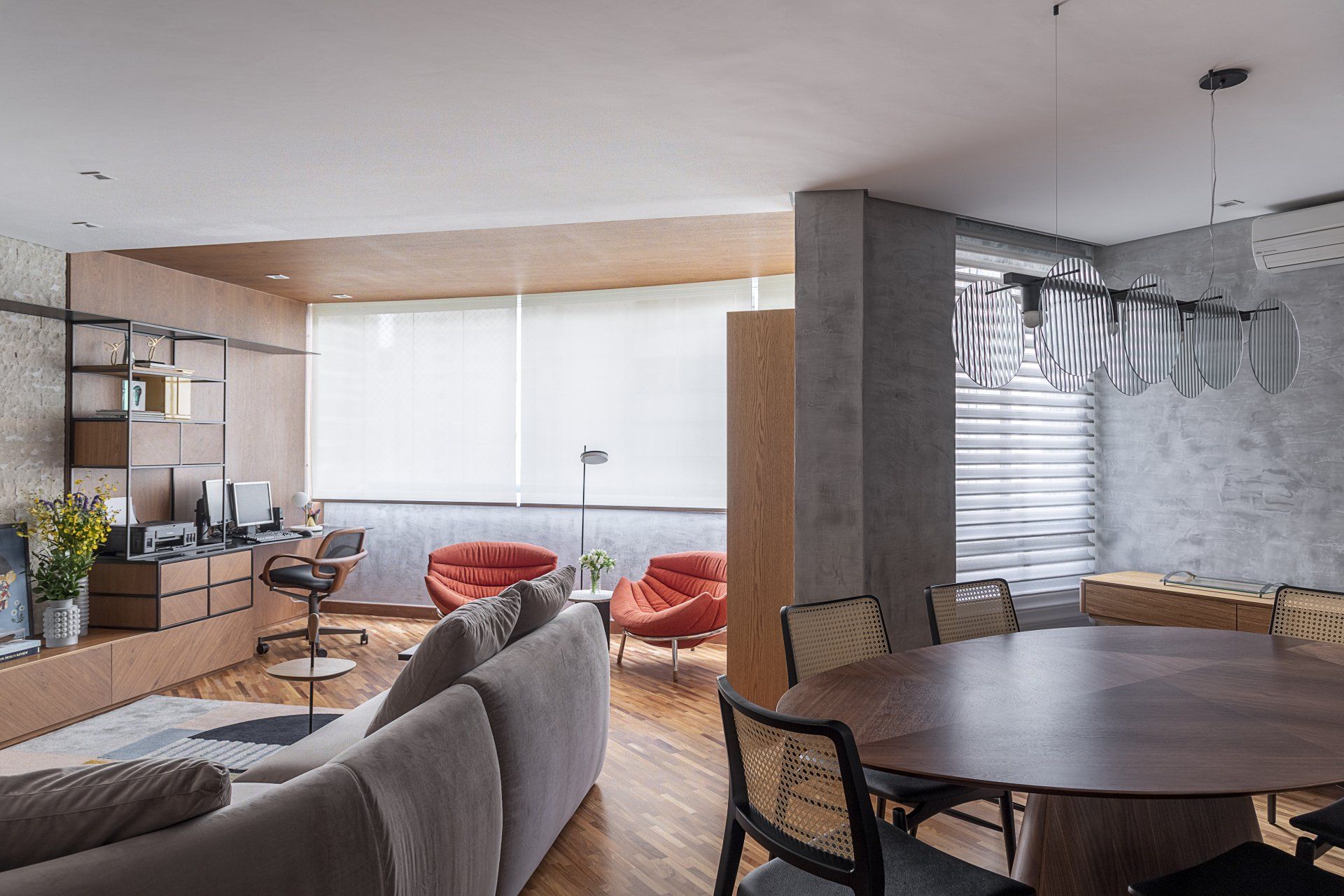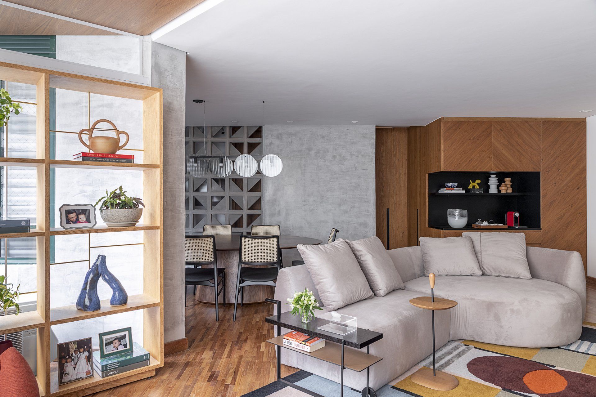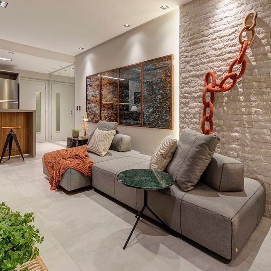 Para quem mora em apartamento, principalmente os mais compactos, integrar ambientes otimiza e amplia espaços. No projeto abaixo da GW Arquitetos, o sofá Lençóis Maranhenses conecta o living com a sala de jantar de forma simplificada, mas com muita personalidade.