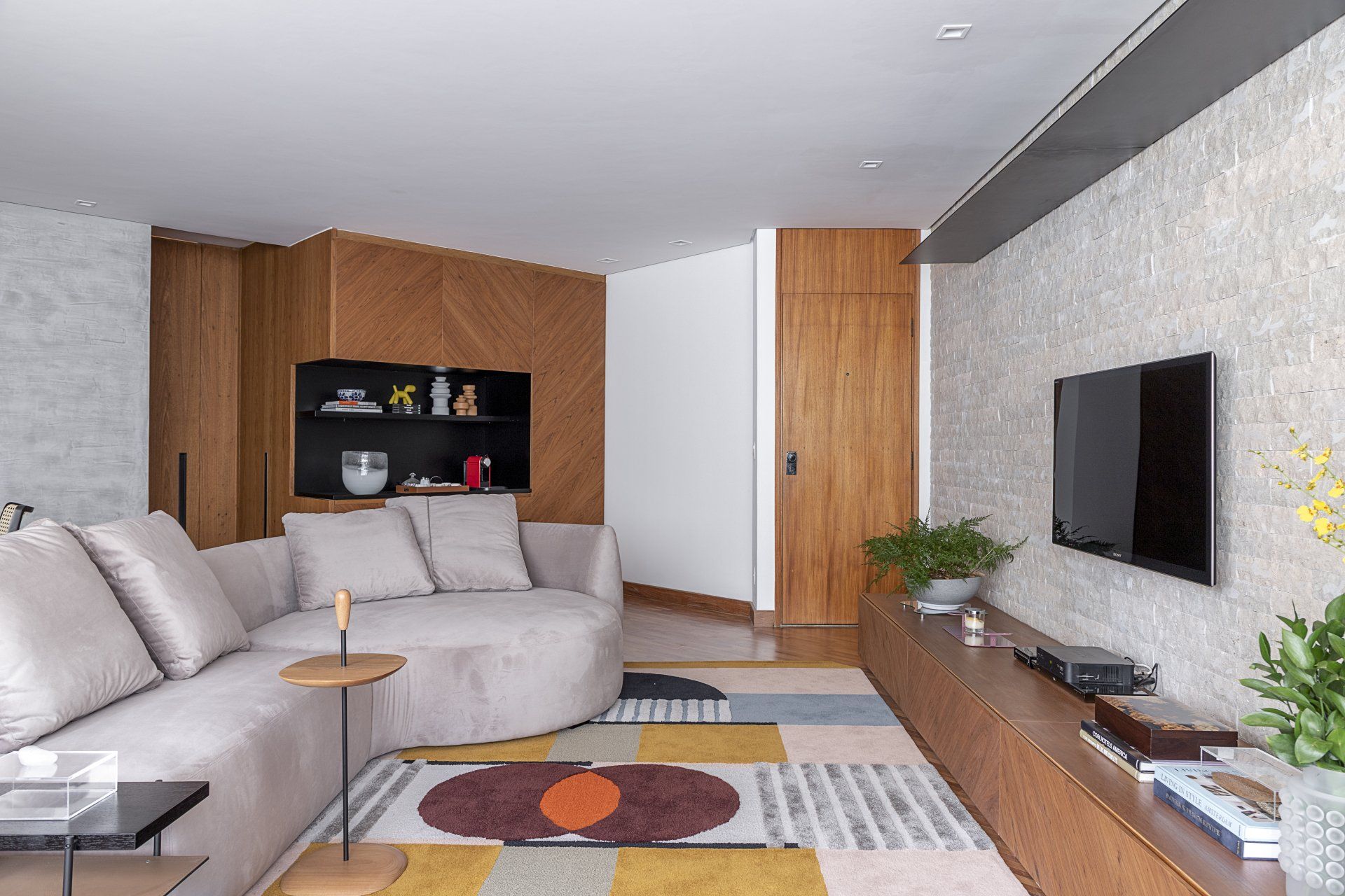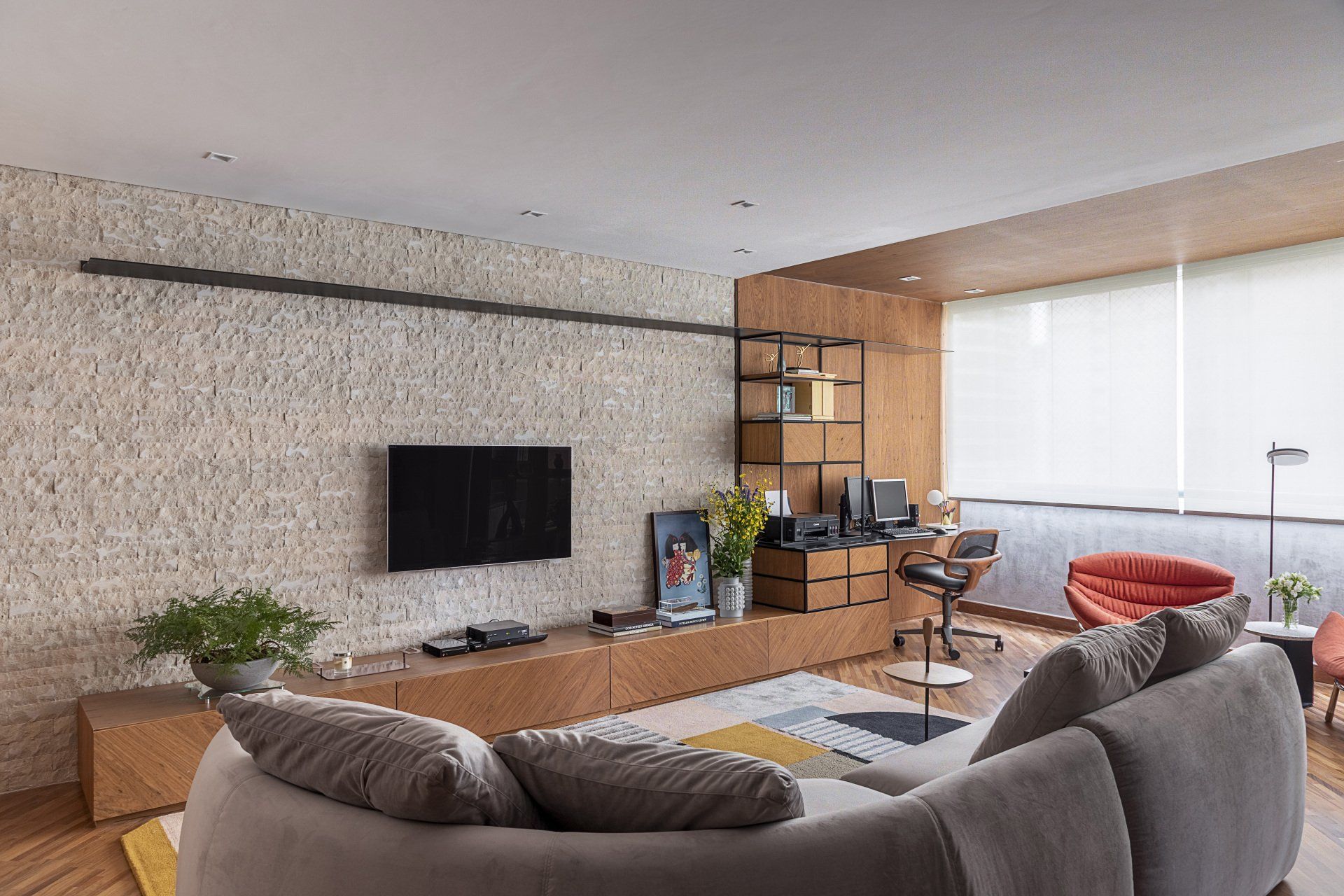 arquiteta Ana Weege, os tons vivos do tapete adicionam mais alegria ao espaço sóbrio, sem quebrar a harmonia da sala.