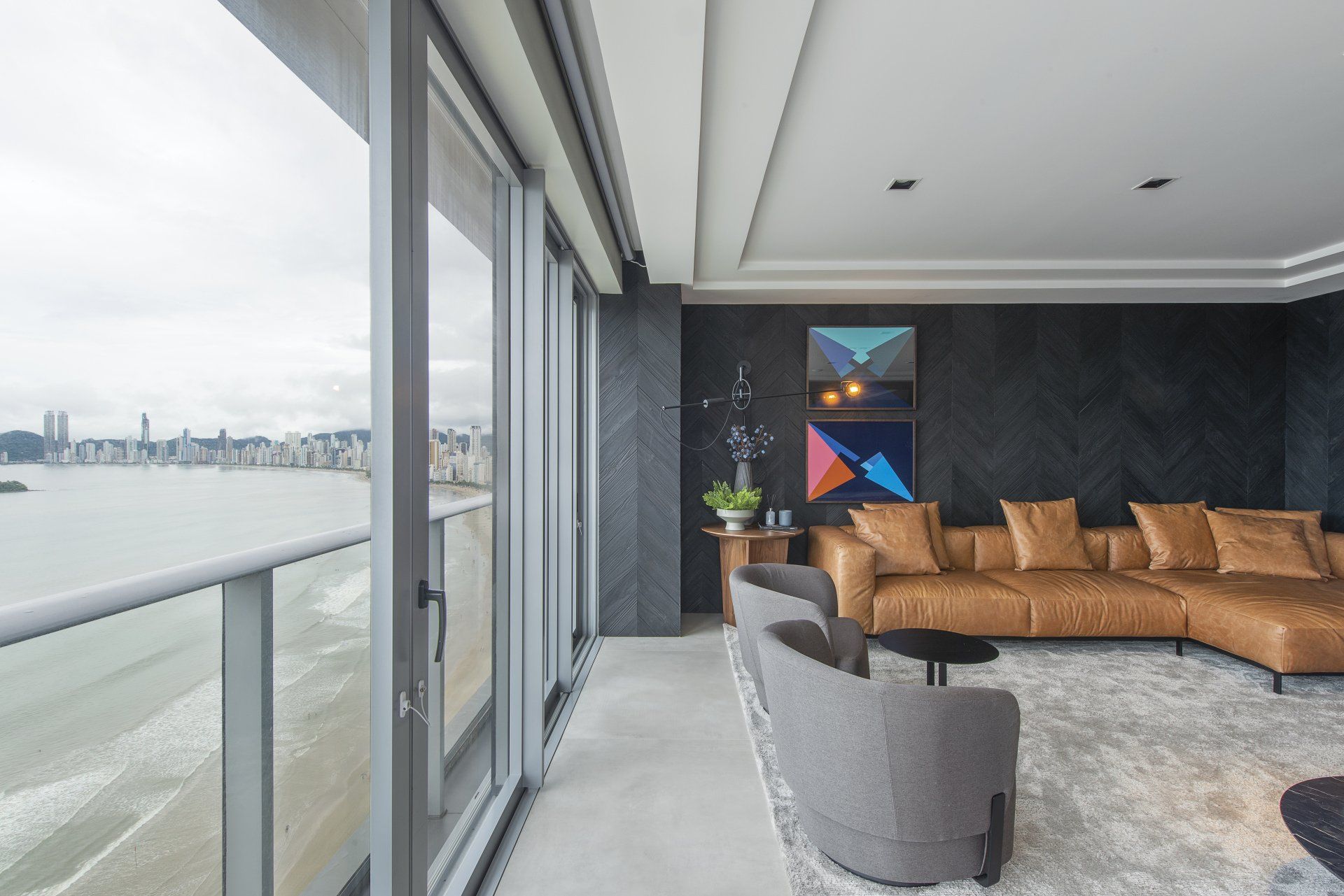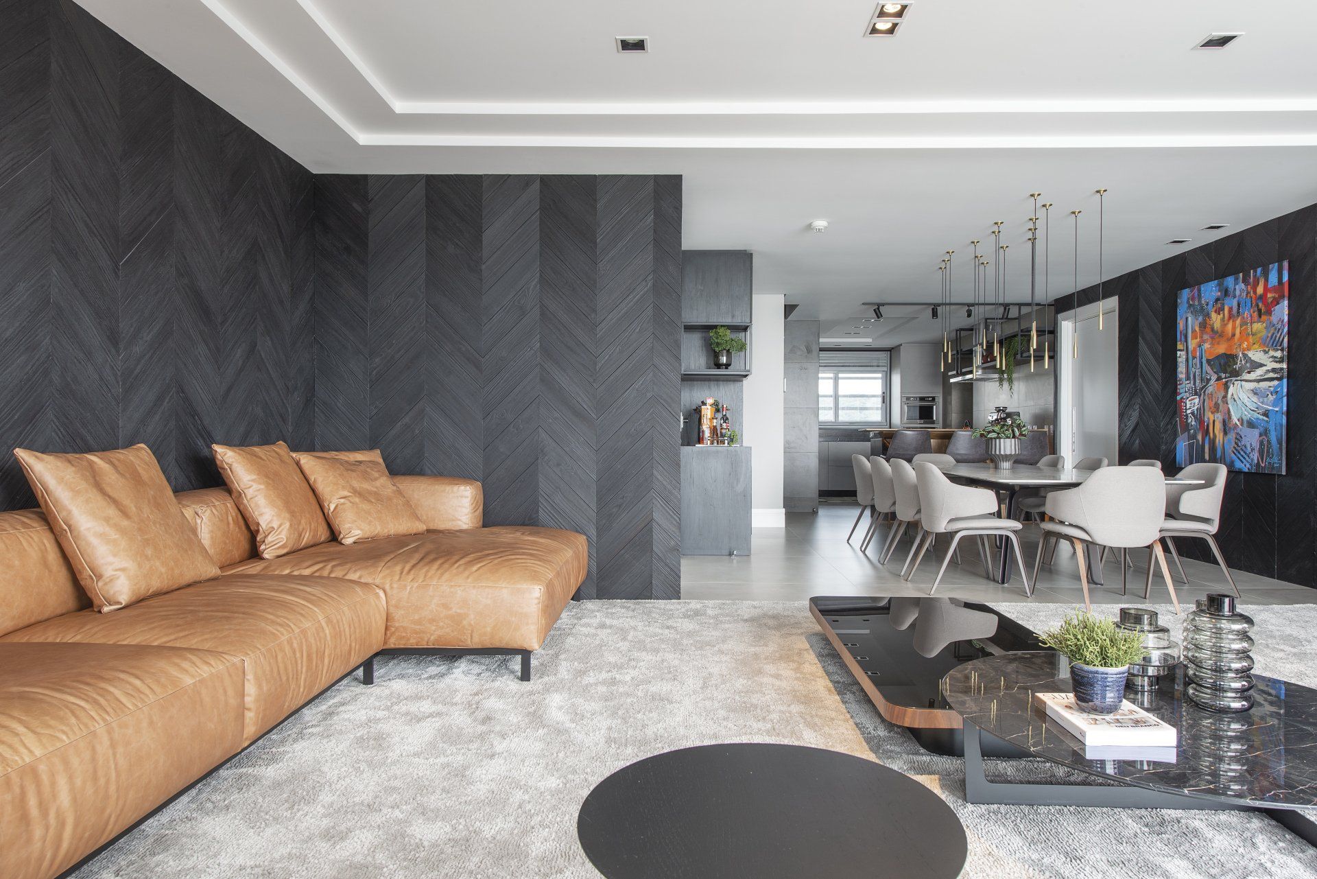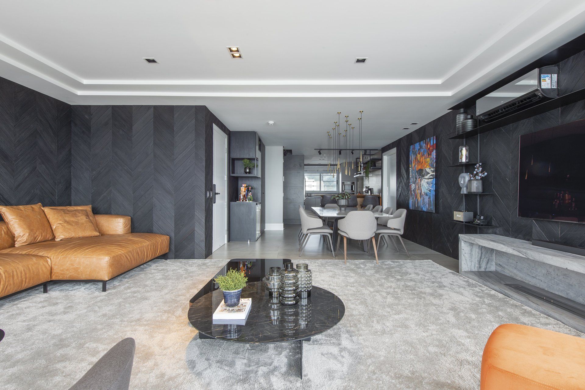 Já pensou em utilizar um revestimento na sua sala de estar com uma cor tão escura quanto o preto? Longe de criar uma atmosfera pesada, a combinação certa de elementos pode dar origem a um ambiente altamente luxuoso, como é o caso desse outro projeto assinado pela arquiteta Daniele Mais. A sobriedade provocada pela cor escura foi quebrada pelo visual despojado do sofá Torus revestido em couro natural caramelo. O Torus é um modelo de assentos amplos ultraconfortáveis e beleza simples e fluída, que incorpora um aspecto mais amarrotado sem abrir mão da elegância.