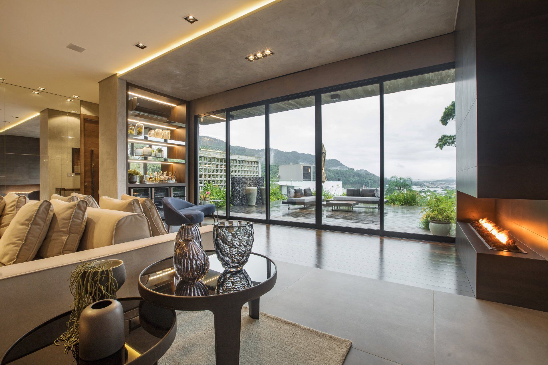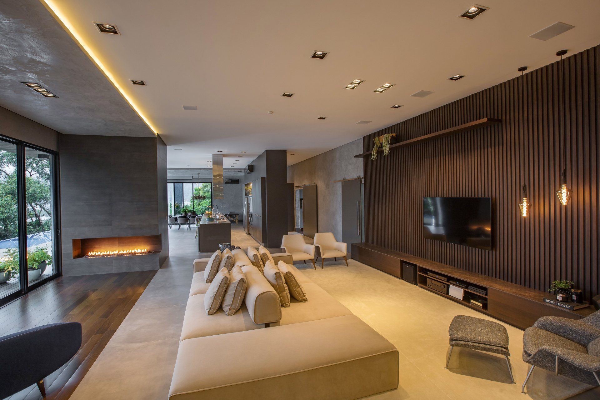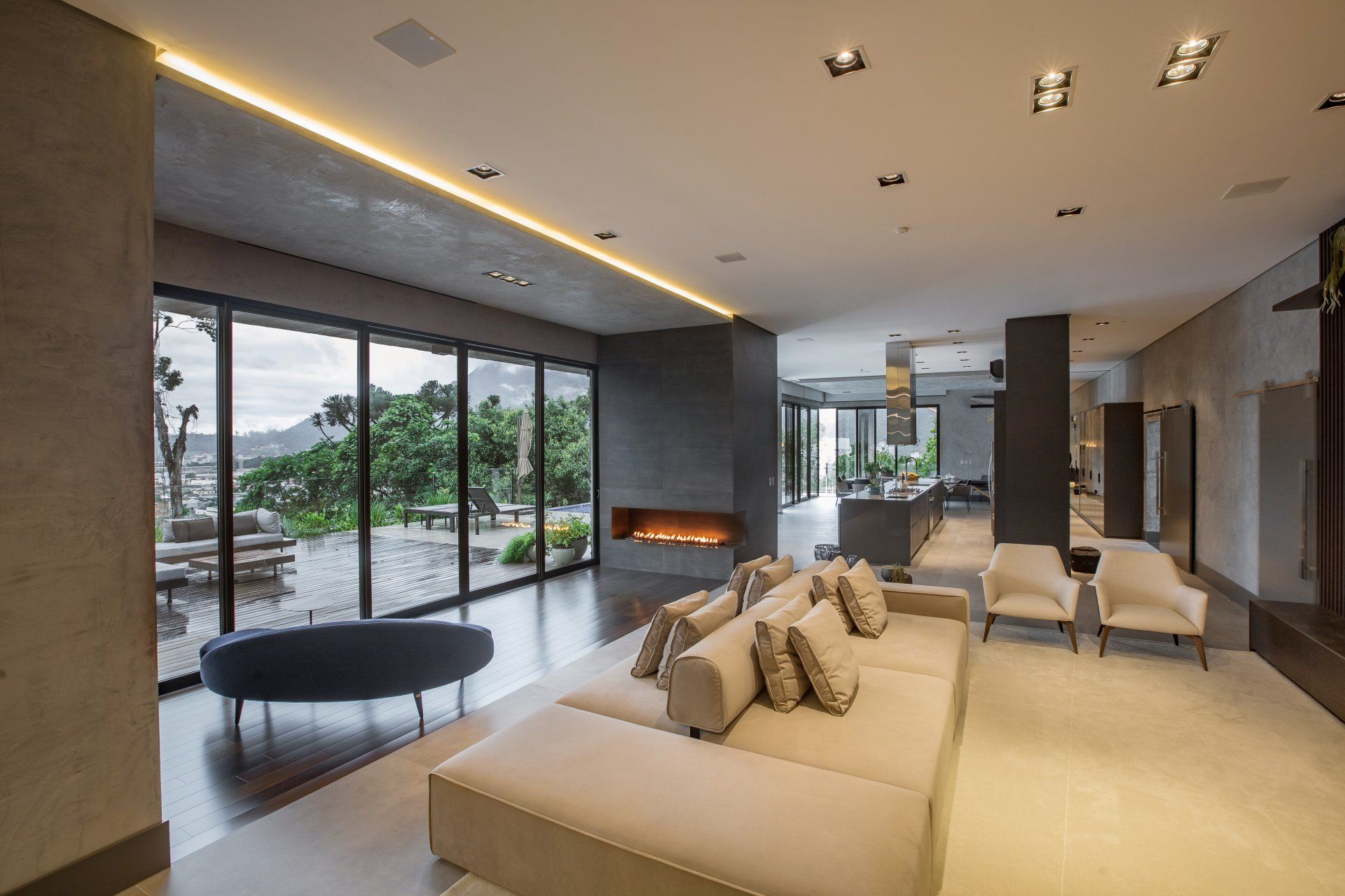 Já pensou em utilizar um revestimento na sua sala de estar com uma cor tão escura quanto o preto? Longe de criar uma atmosfera pesada, a combinação certa de elementos pode dar origem a um ambiente altamente luxuoso, como é o caso desse outro projeto assinado pela arquiteta Daniele Mais. A sobriedade provocada pela cor escura foi quebrada pelo visual despojado do sofá Torus revestido em couro natural caramelo. O Torus é um modelo de assentos amplos ultraconfortáveis e beleza simples e fluída, que incorpora um aspecto mais amarrotado sem abrir mão da elegância.