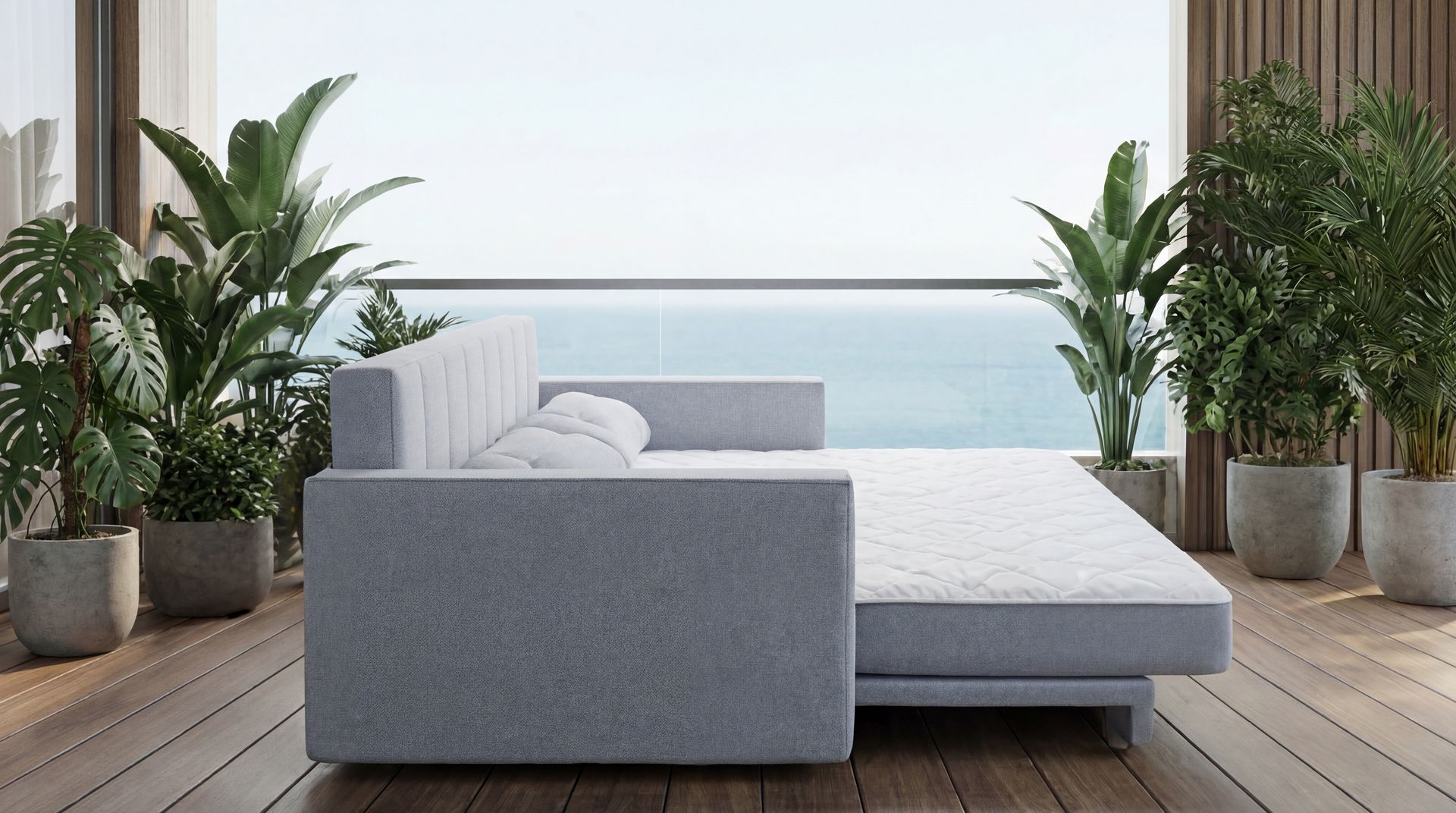 Evans, by Studio Bell'Arte - The Evans has a mechanism that transforms the seat into a comfortable bed. When opened, the inner surface of the seat becomes a D-33 foam mattress with a beautiful embroidered jacquard top, while the detailed-stitched backrest serves as an elegant headboard. Additional stitching on the cushions and piping on the arms lend this model a particularly charming appeal.