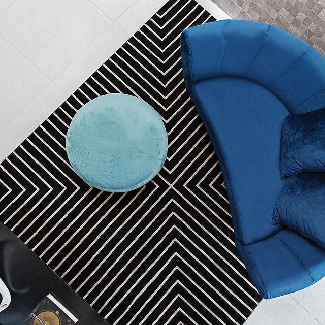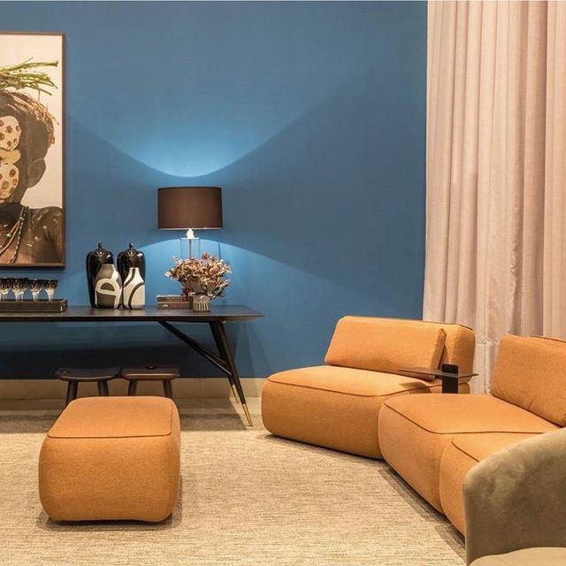 Puff Mali, do designer Ricardo Barddal, complementa o ton sur ton em azul com o estofado Taiga, com design assinado por Fabricio Roncca.