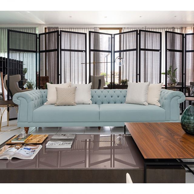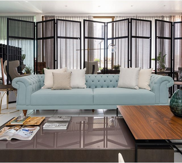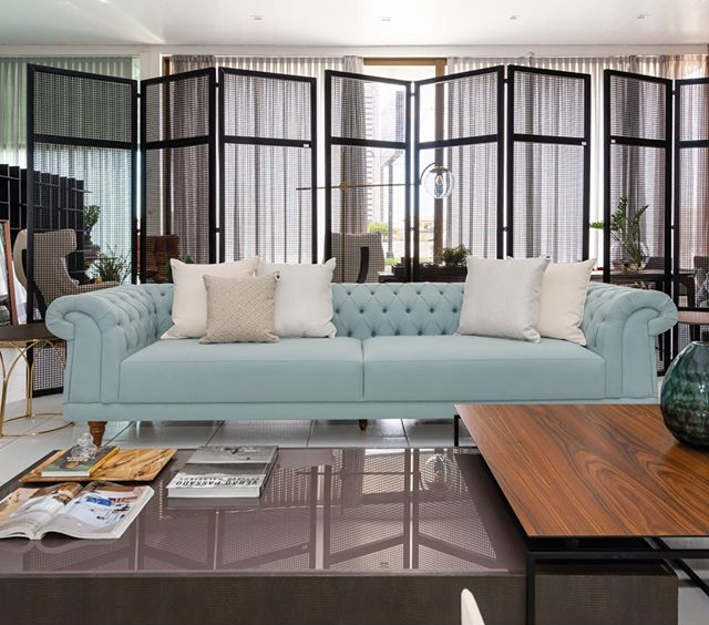 O verde e o azul escuro também são tendências de cores para sofás.