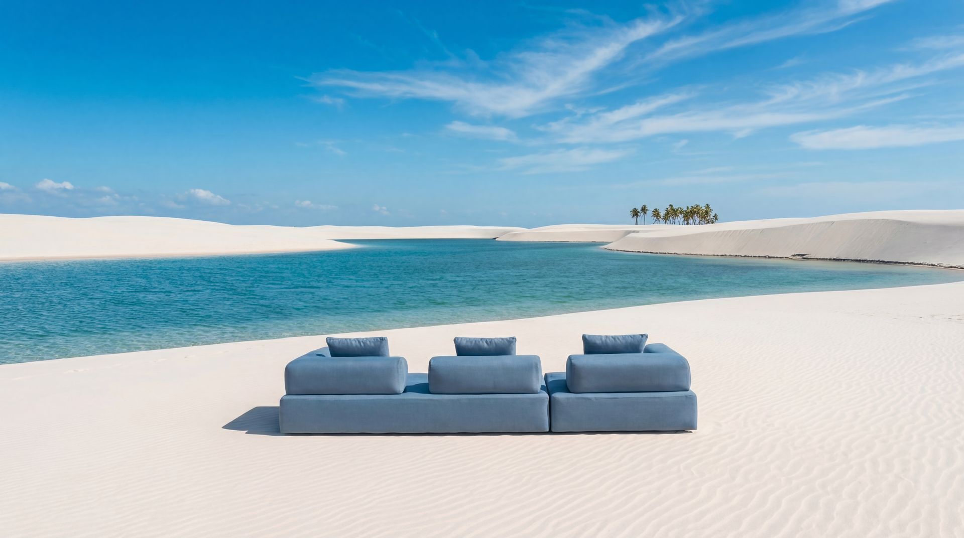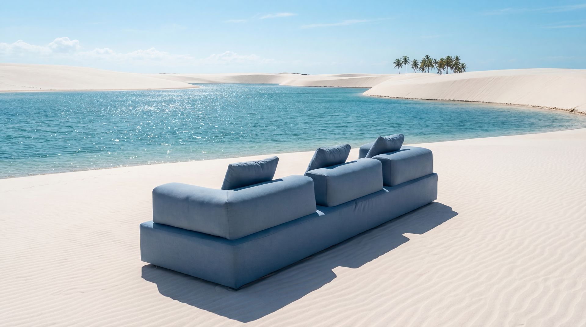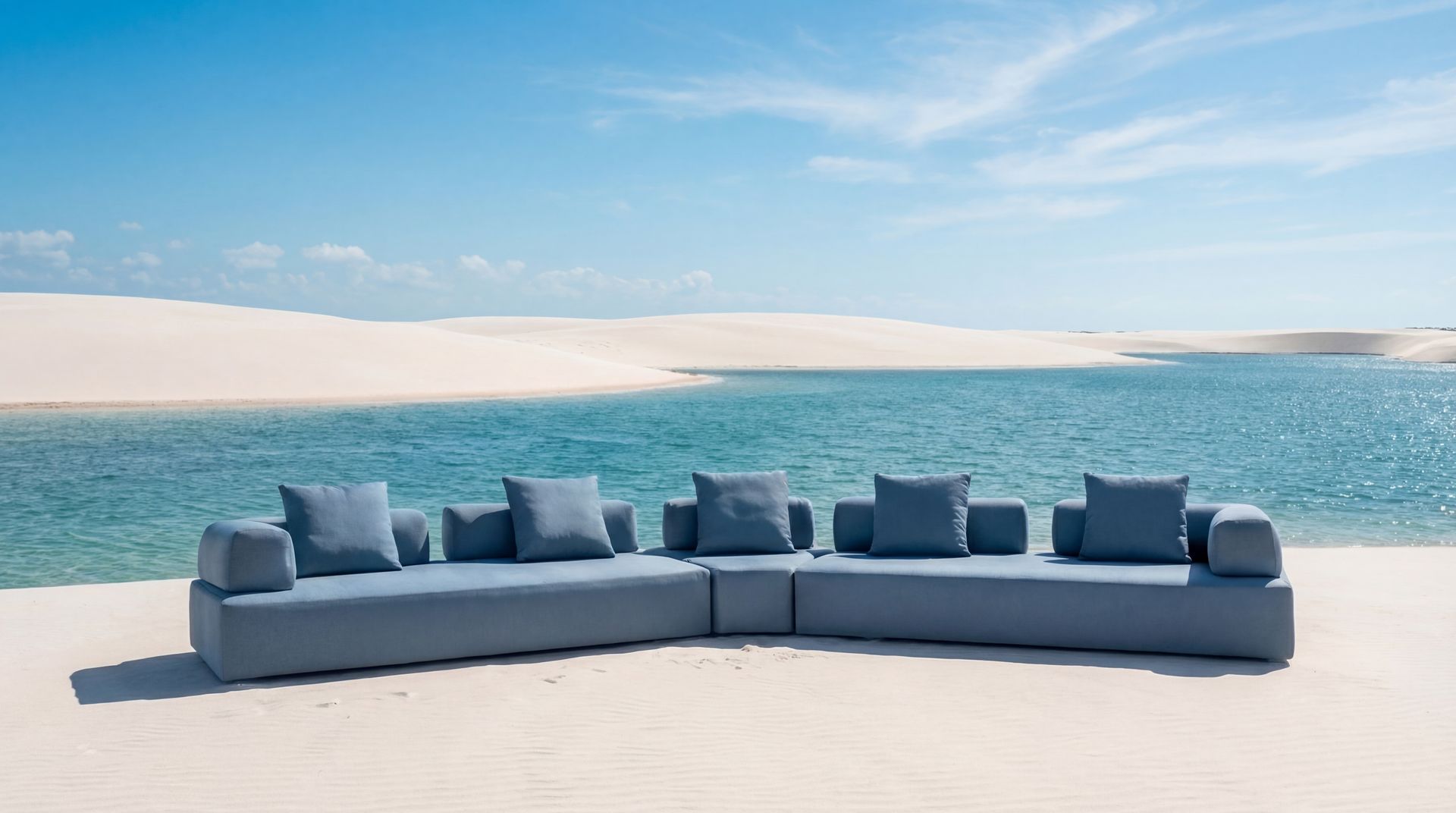 Lençóis Maranhenses Outdoor – A versão outdoor do Lençóis Maranhenses foi especialmente desenvolvida para atender projetos externos de décor. Indicado para espaços de lazer ao ar livre, como varandas, decks de piscina e área de festas, o estofado possui opcionais de capa e revestimento 100% impermeáveis.